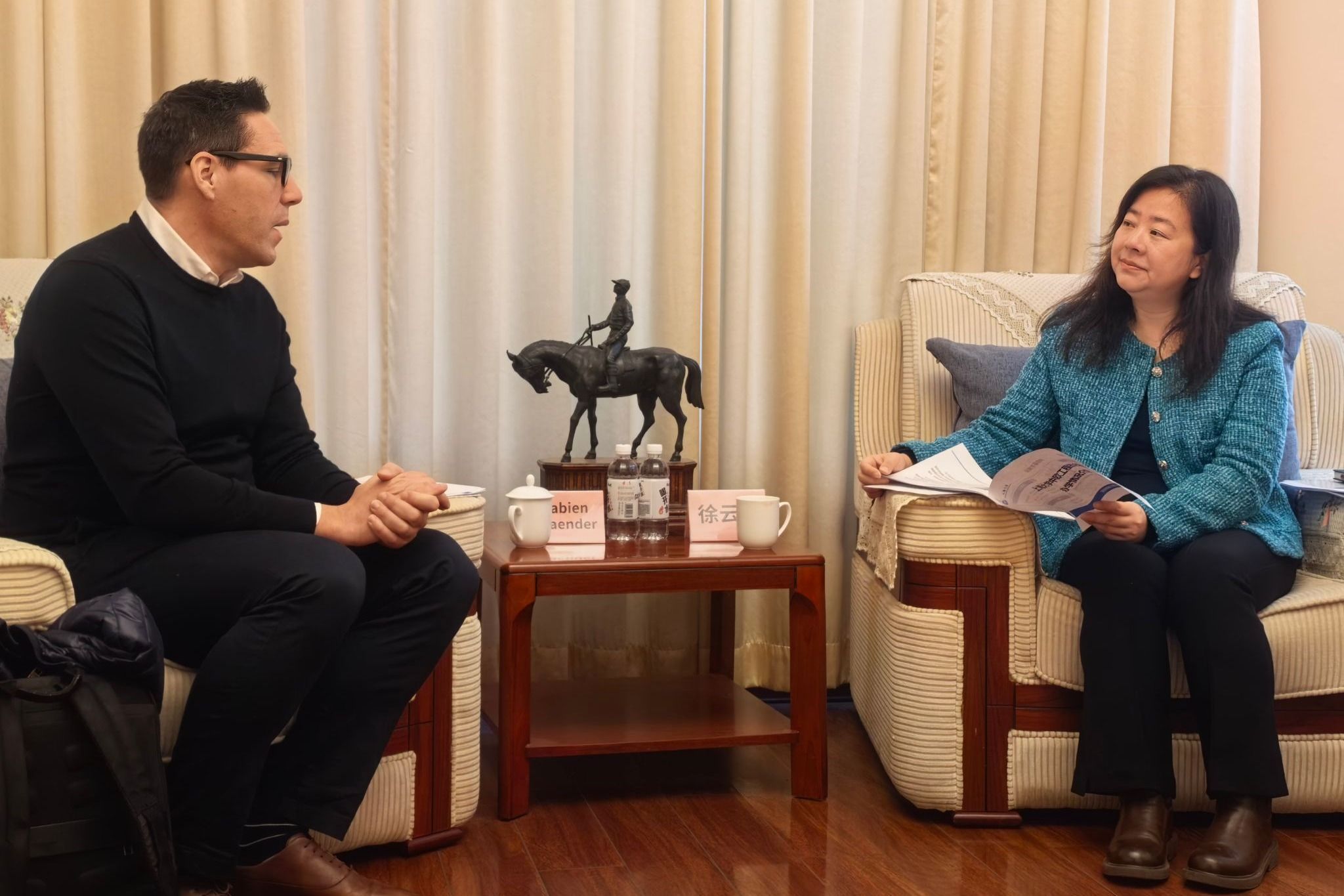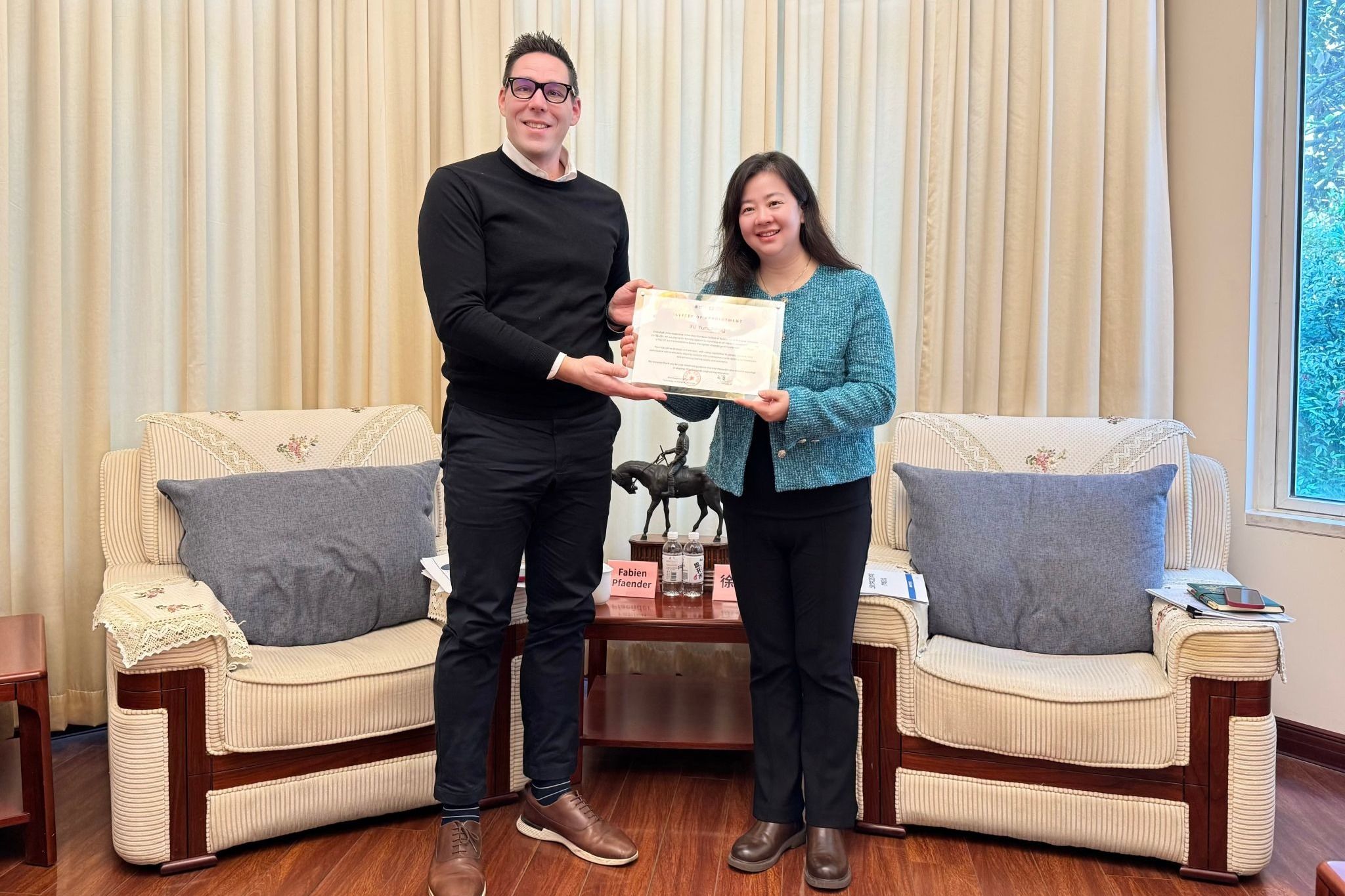 最后,中欧学院Fabien院长诚邀徐云程主任深入参与中欧学院的育人工作,向她颁发了中欧学院联合管理委员会成员任命书,为学院师生对接企业资源、开展实践项目创造条件,实现校企互利共赢。