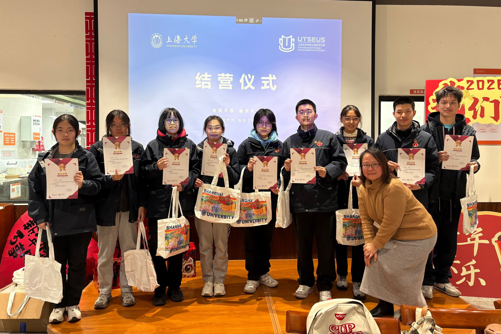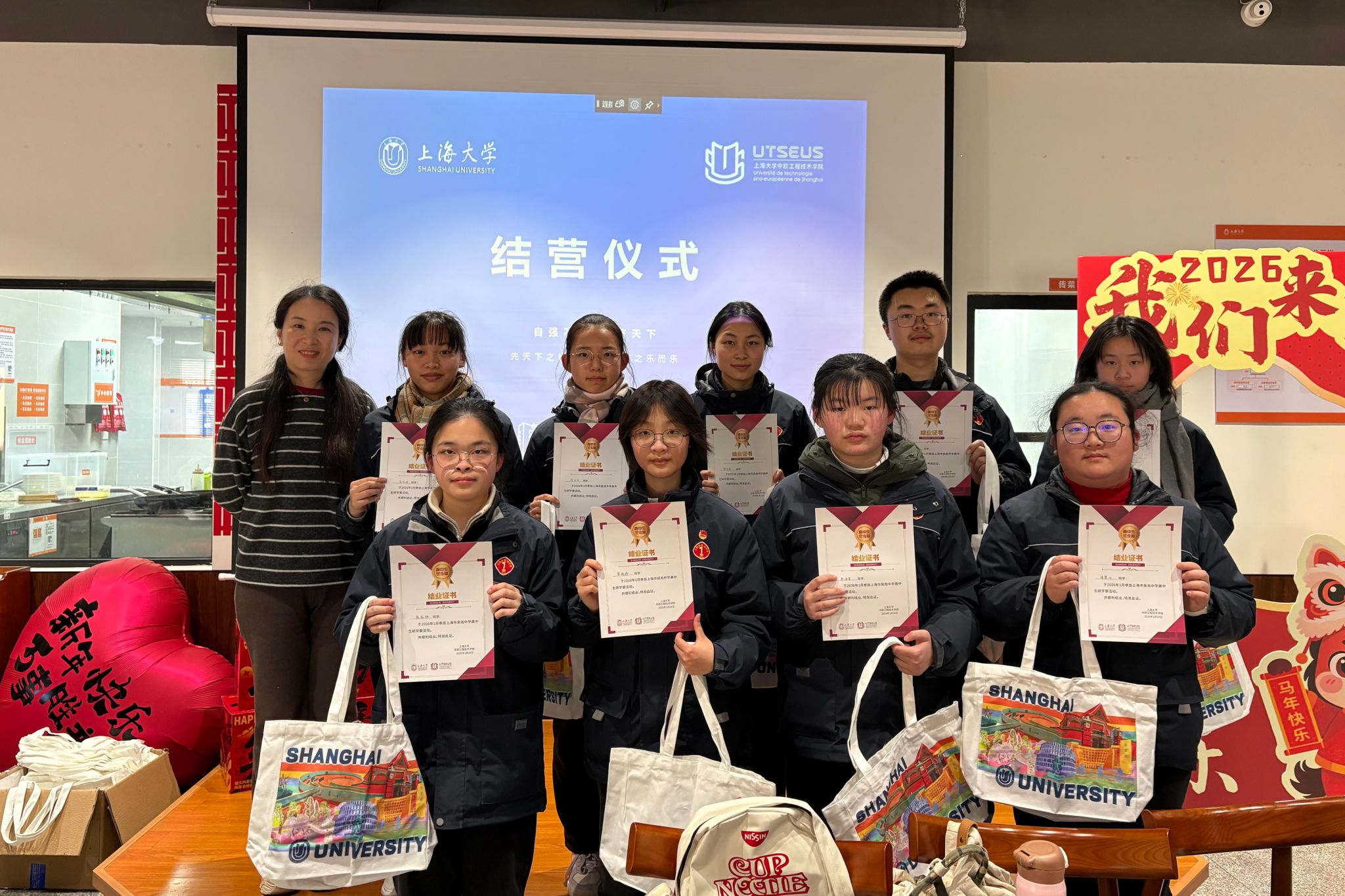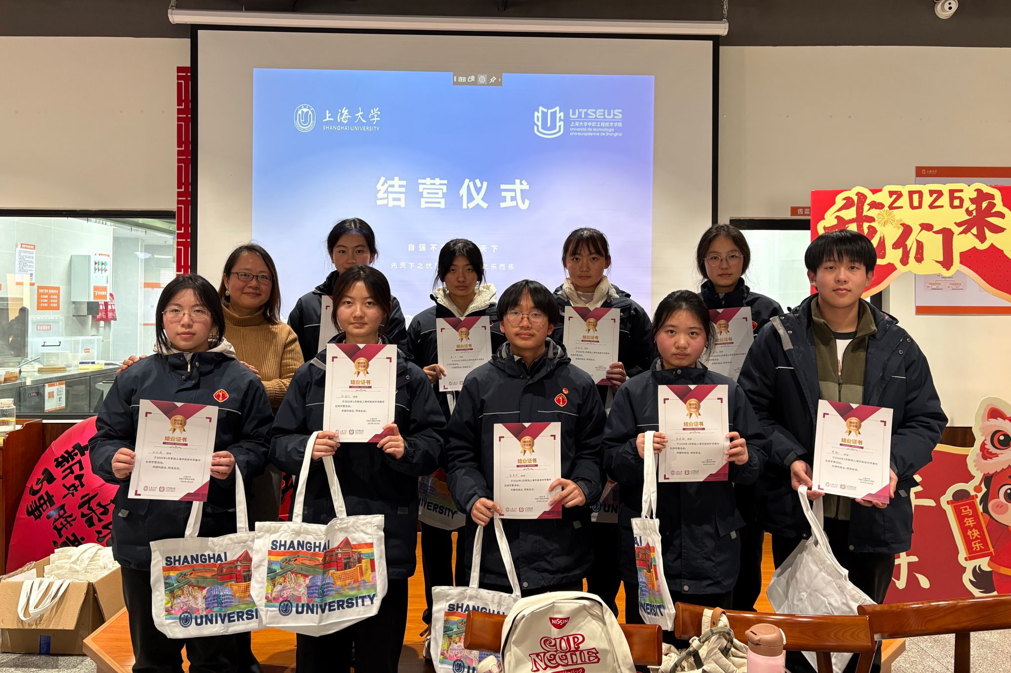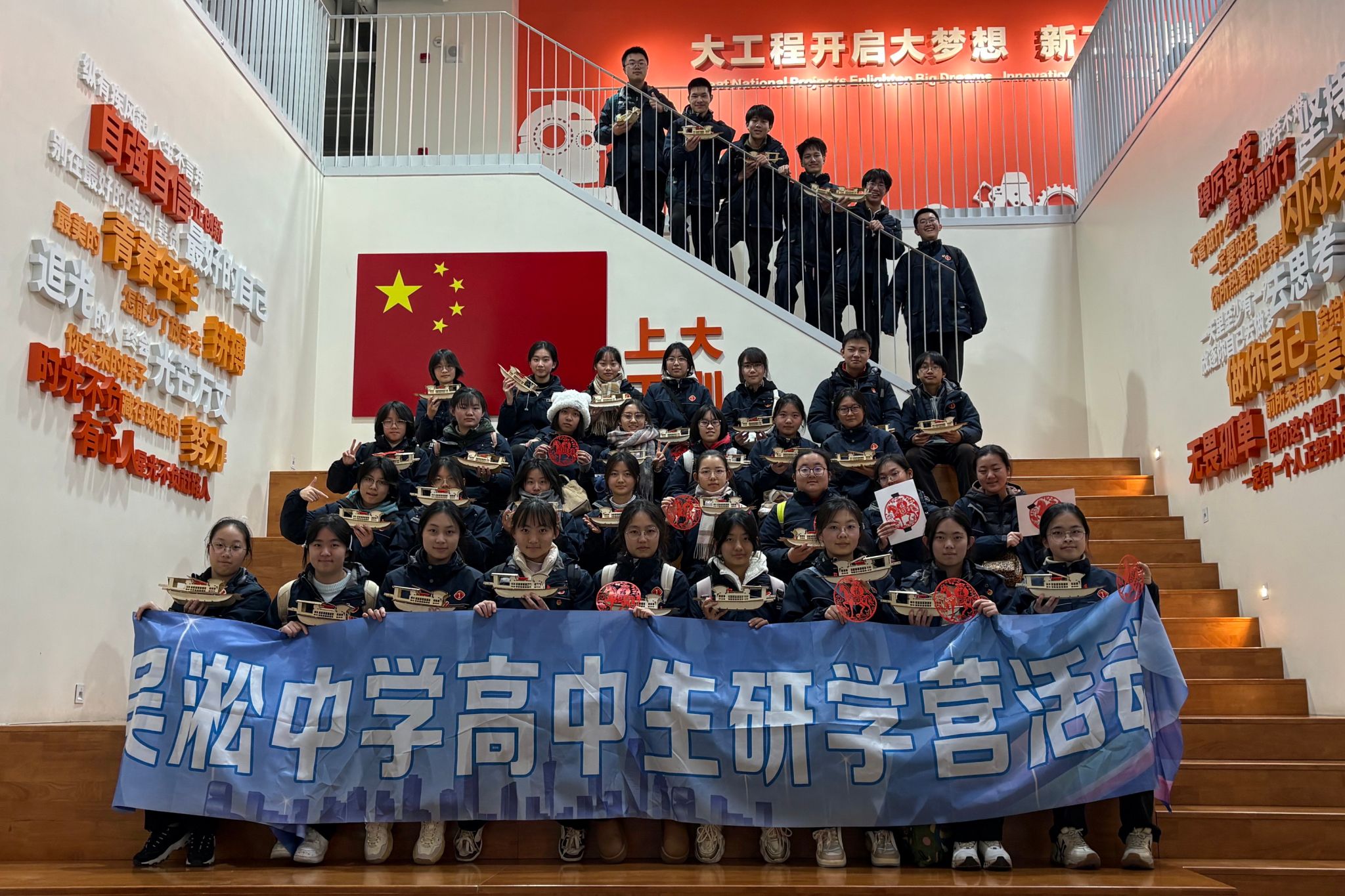 伴随着欢声笑语,本次研学活动圆满落下帷幕。在结营仪式上,隋萍萍和沈志红老师为同学们颁发结营证书和纪念品,师生合影留念,为这段充实而难忘的研学之旅画上句号。通过一天的学习与体验,吴淞中学的同学们不仅拓宽了视野、增长了见识,也进一步坚定了对未来学习道路的信心。