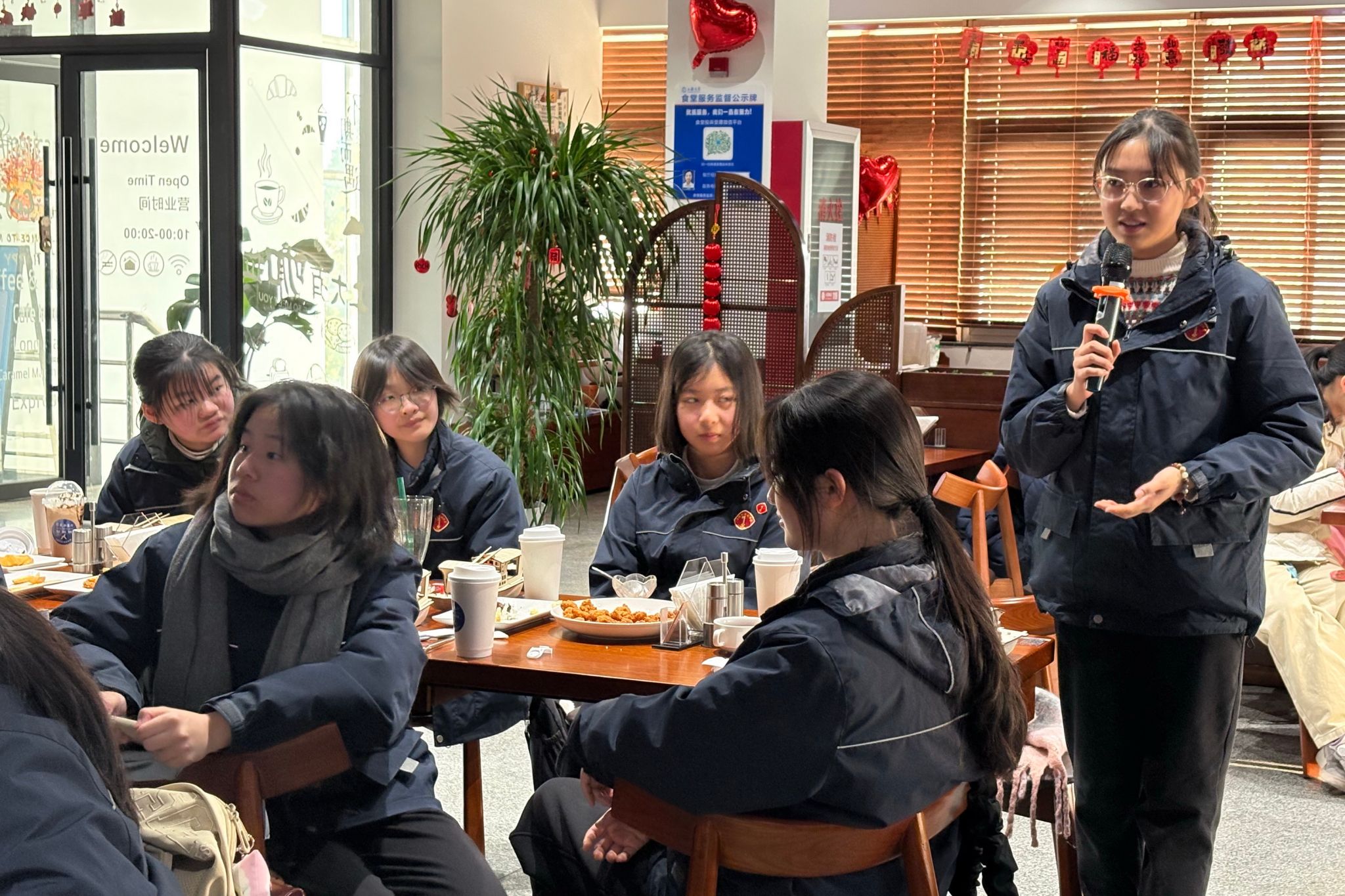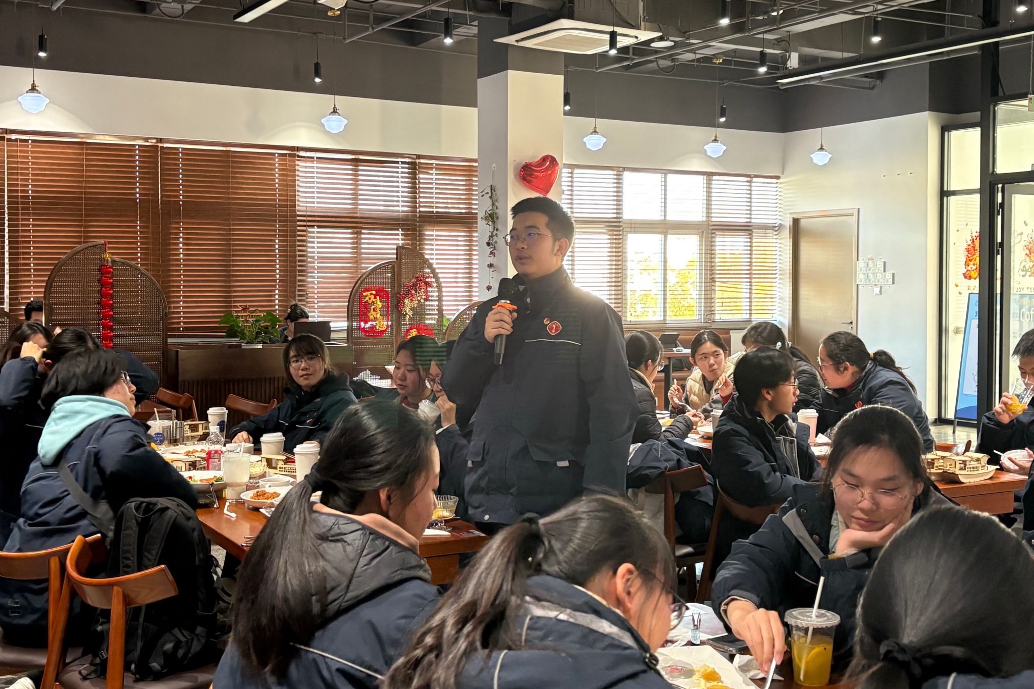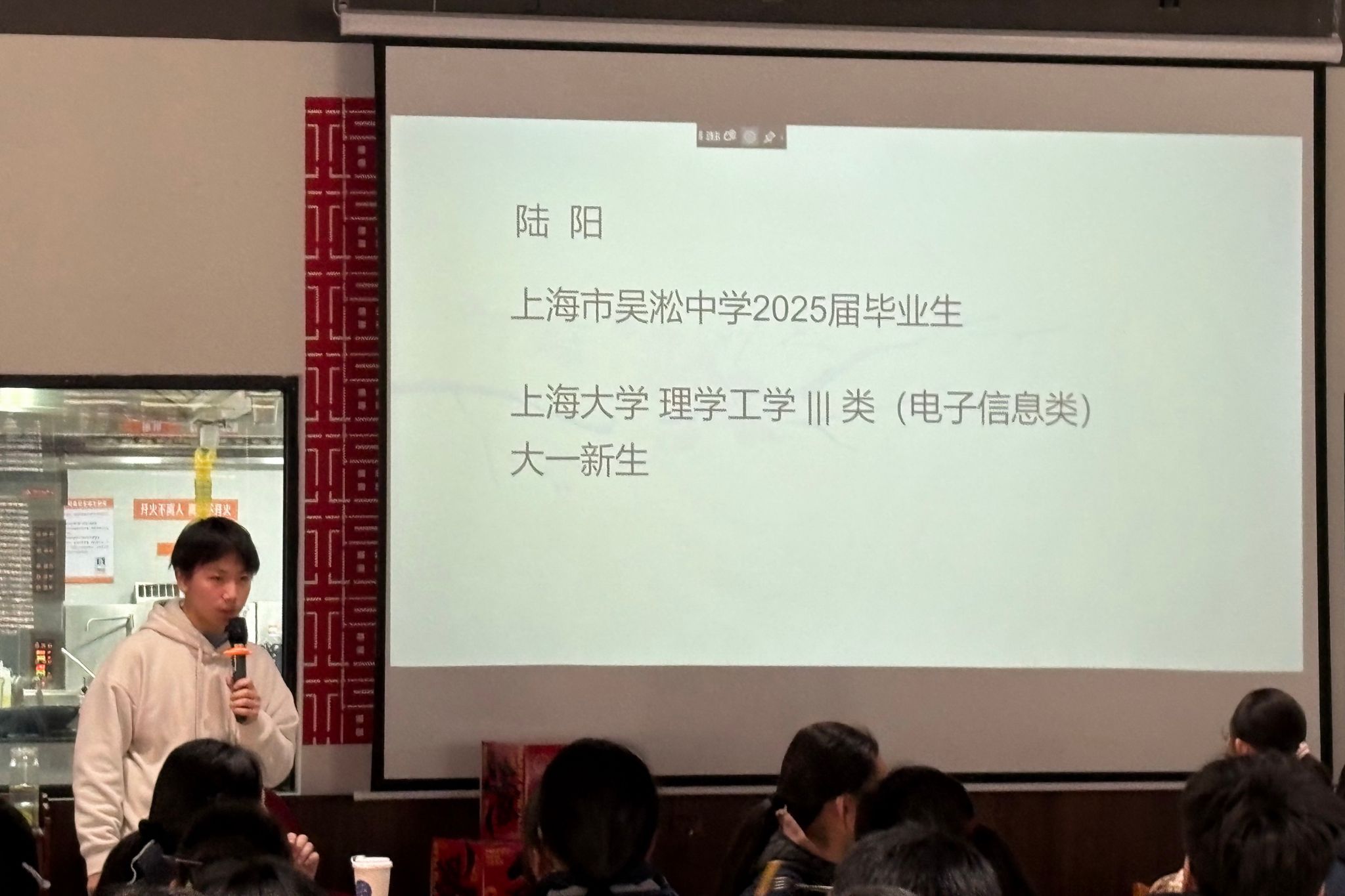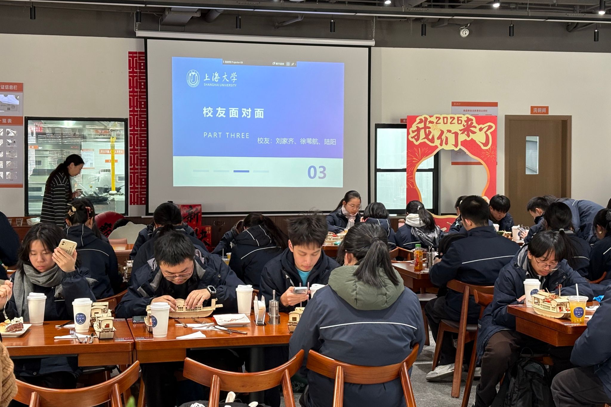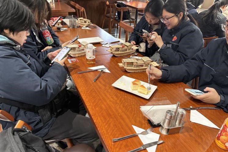 丰富的实践体验活动后,同学们齐聚尔美食堂,度过了一段轻松而温馨的下午茶时光。校友陆阳、刘家齐和徐苇航同学分享了他们在上海大学的学习经历与成长感悟。真诚而生动的讲述让同学们对大学生活的方方面面有了更具体的认识,也为未来的学习规划提供了有益的参考。