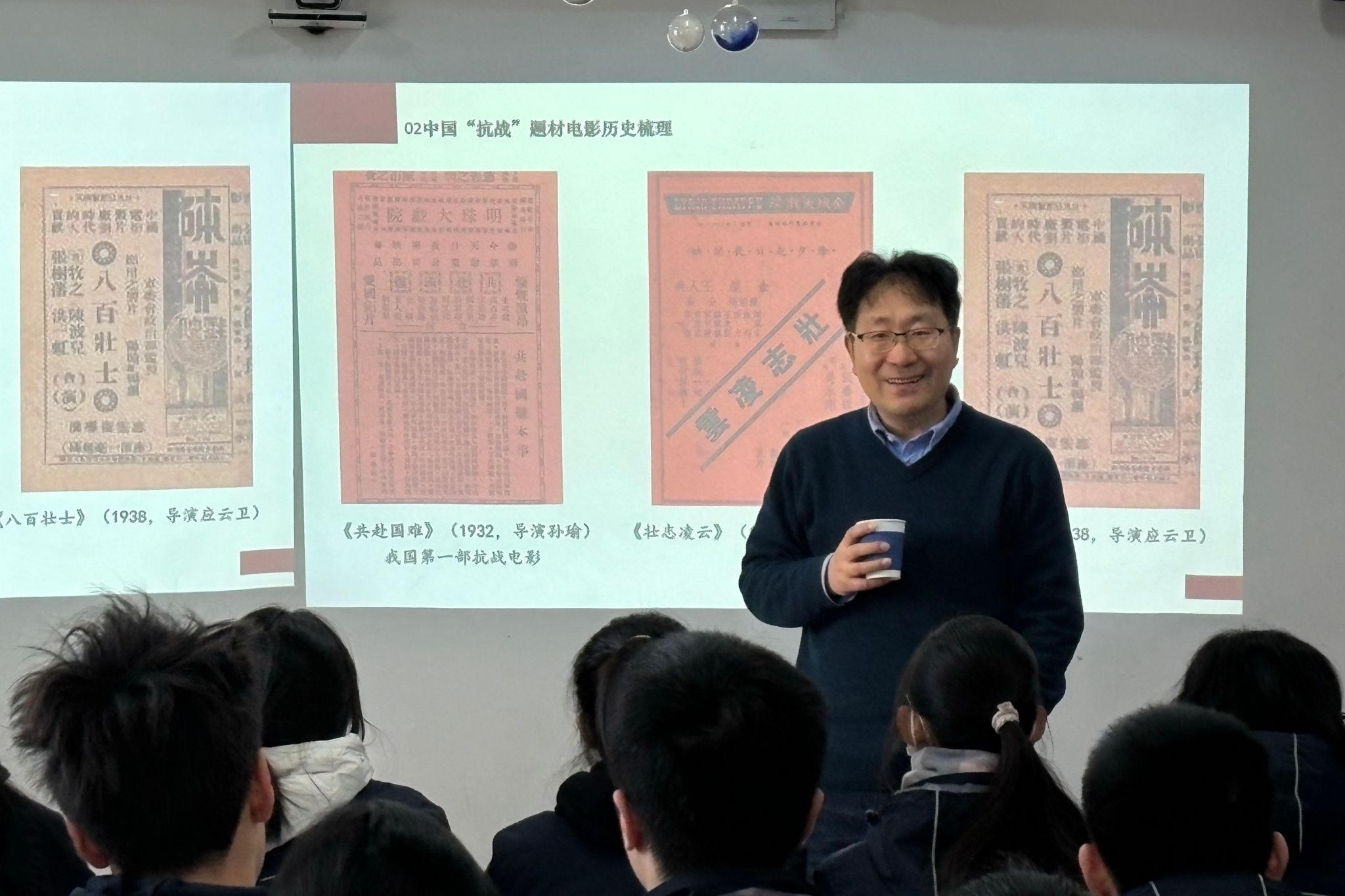 随后,上海大学电影学院刘海波教授以“《南京照相馆》与《731》:电影艺术如何唤醒历史记忆”为题,为同学们带来了一场兼具思想深度与艺术感染力的讲座。刘老师带着同学们赏析经典抗战题材电影作品,深入阐释了影像艺术在记录历史、传递记忆中的重要作用,引发了同学们对历史与现实的深入思考。通过分析《南京照相馆》和《731》,同学们逐渐理解了电影不仅是一种艺术表达形式,更是承载历史与情感的重要媒介。