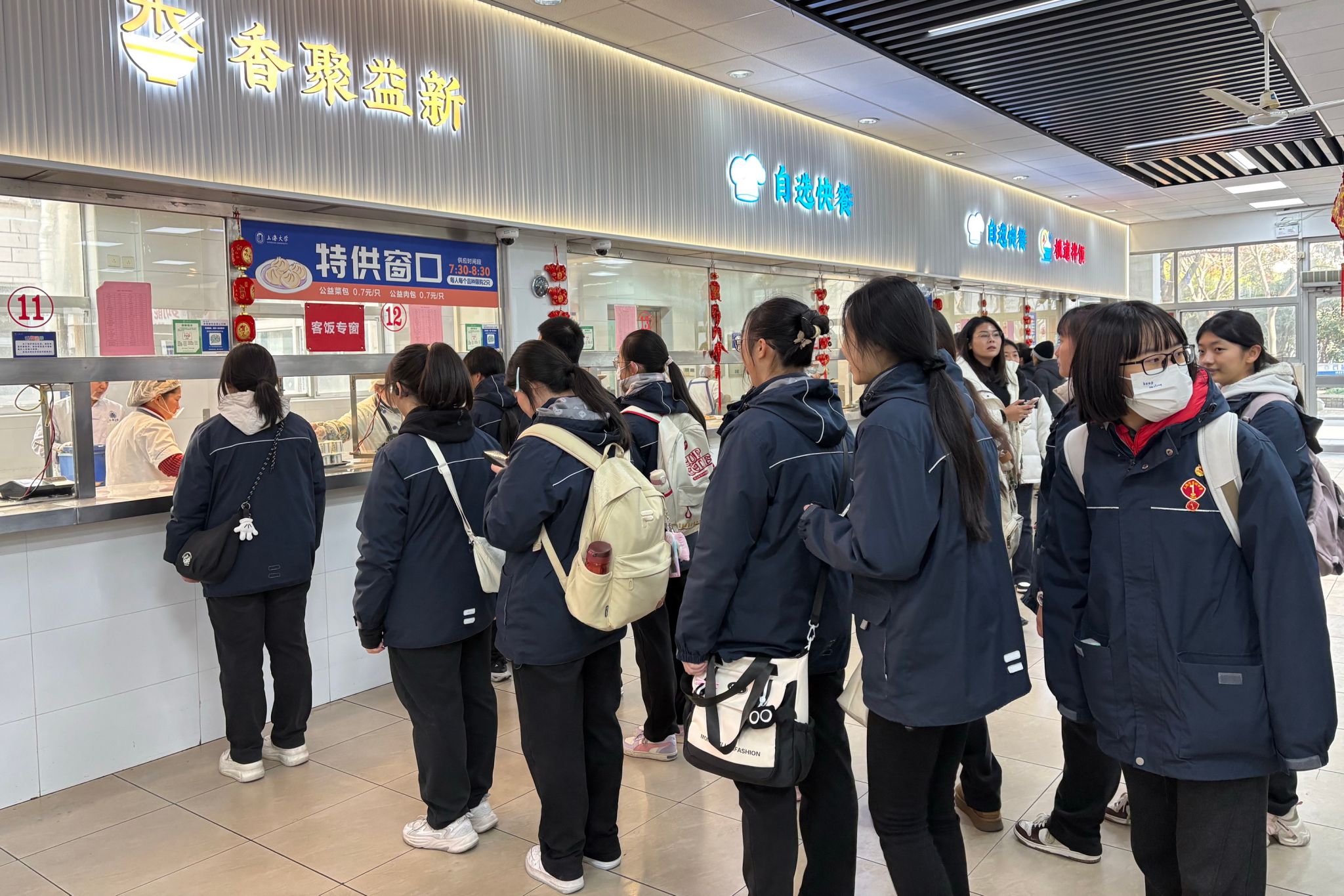中午,同学们来到益新食堂,在轻松愉快的氛围中品尝健康可口的午餐,切身感受上海大学丰富而有序的校园生活氛围。